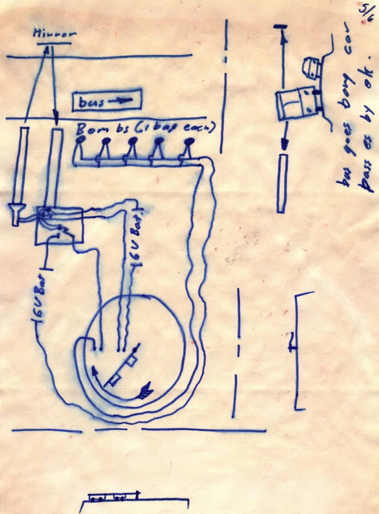 Il disegno di Zodiac, pur avendo l’aspetto di uno schizzo e non essendo particolarmente preciso nei dettagli, riesce comunque a mostrare chiaramente il funzionamento del circuito e a rendere in modo efficace l’idea complessiva del progetto. Allo stesso tempo, la natura approssimativa della rappresentazione e alcune soluzioni tecniche solo abbozzate lasciano intuire che il congegno, per quanto concettualmente interessante, risulterebbe difficilmente applicabile nella pratica.