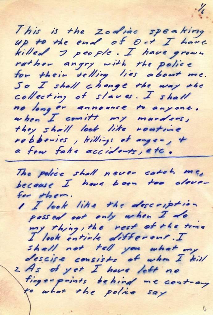 1/6Qui è Zodiac che parla, prima della fine di ott. ho ucciso sette persone. Mi sono arrabbiato davvero molto con la polizia per le bugie che dice su di me. Quindi cambierò il modo di collezionare i miei schiavi. Non annuncerò più a nessuno quando commetterò i miei omicidi, sembreranno rapine di routine, omicidi per rabbia, & qualche finto incidente, etc. La polizia non riuscirà a trovarmi, perché sono troppo scaltro per loro.