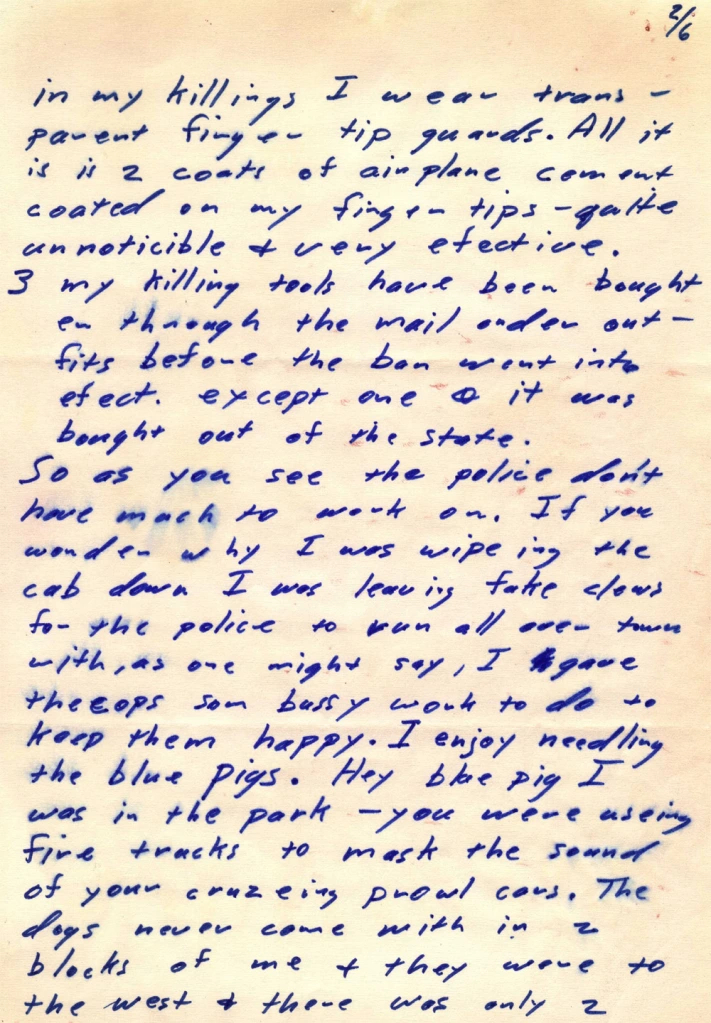 Fino a quel momento, infatti, le sue vittime erano state giovani coppie o adulti scelti in contesti isolati. Con la Bus Bomb Letter, l’assassino sposta l’attenzione su un bersaglio simbolico e vulnerabile, generando un’ondata di panico nella popolazione e costringendo le autorità a intensificare i controlli sui mezzi scolastici, trasformando Zodiac in un potenziale terrorista urbano.