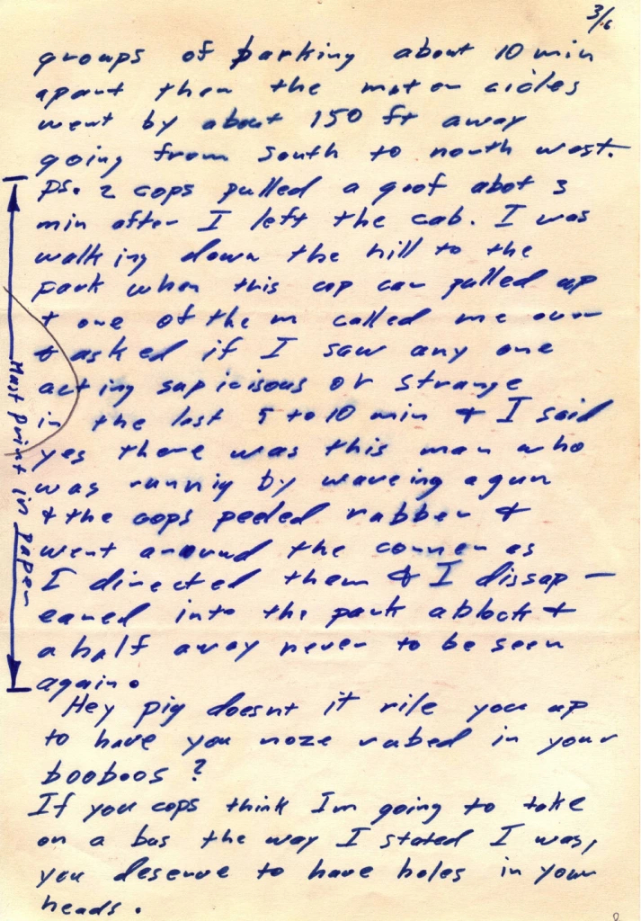 La cosiddetta Bus Bomb Letter è considerata uno dei documenti più inquietanti e significativi dell’intera corrispondenza attribuita al Killer Zodiac. Fu inviata al San Francisco Chronicle il 9 novembre 1969.