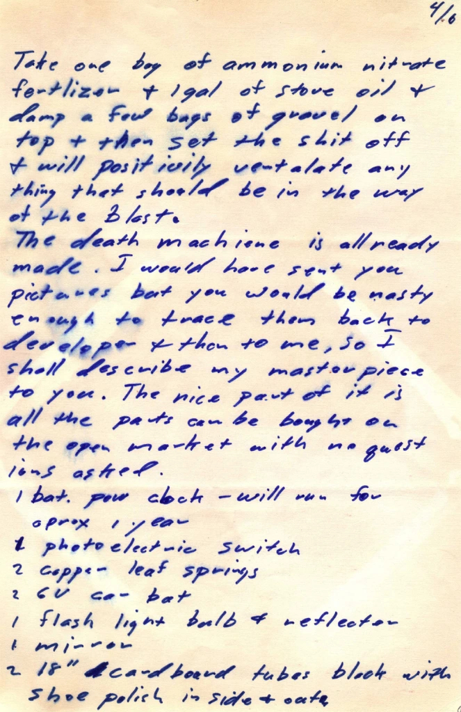 4/6 Prendete una sacca di fertilizzante nitrato di ammonio & un gallone di kerosene & più qualche sacchetto di ghiaia & mettete insieme la cazzata & date ossigeno a tutto ciò che dovrebbe far funzionare un’esplosione. La macchina della morte è già ultimata.
