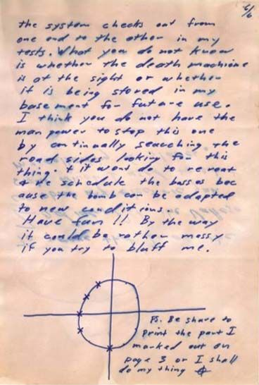 Uno degli elementi più noti della lettera è il diagramma elettrico dell’ordigno, quello che lui chiamava “la macchina della morte”, che, secondo lui, avrebbe potuto piazzare lungo il percorso di uno scuolabus. Zodiac disegna uno schema che illustra il funzionamento della bomba, descrivendone anche i componenti. Nonostante l’apparente precisione, gli esperti hanno sempre discusso sull’effettiva fattibilità del dispositivo: alcuni ritengono che fosse un progetto rudimentale e poco realistico, altri che potesse effettivamente funzionare se costruito da qualcuno con competenze adeguate.