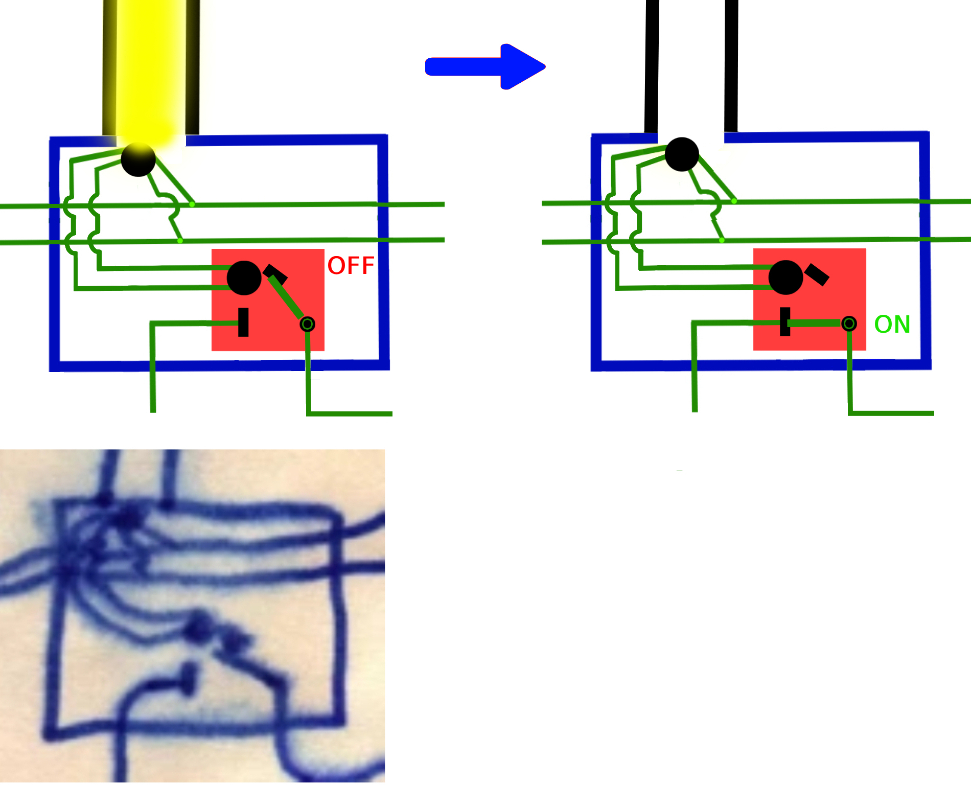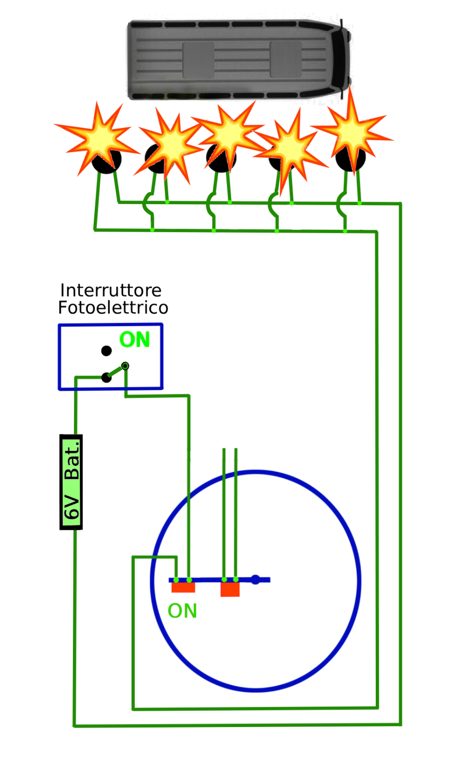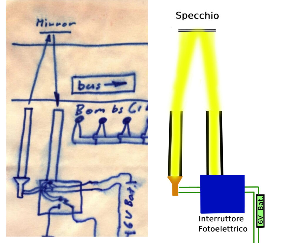 • Quando il fascio di luce viene interrotto dall’ autobus, il circuito di controllo collega all’interruttore — evidenziato in rosso i fili che sono in parallelo a quelli che alimentano la torcia, in modo che la corrente raggiunga l’interruttore e lo faccia scattare.