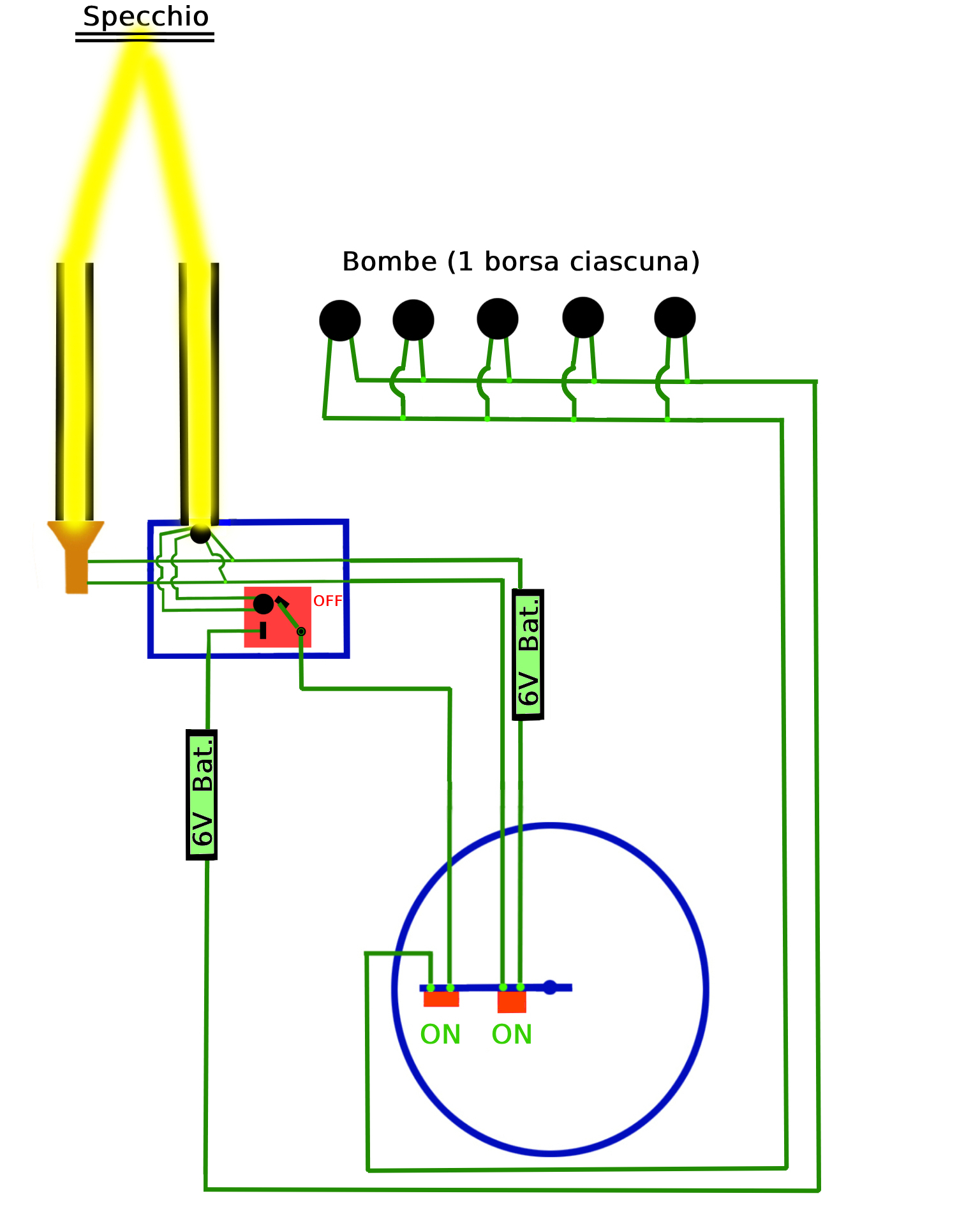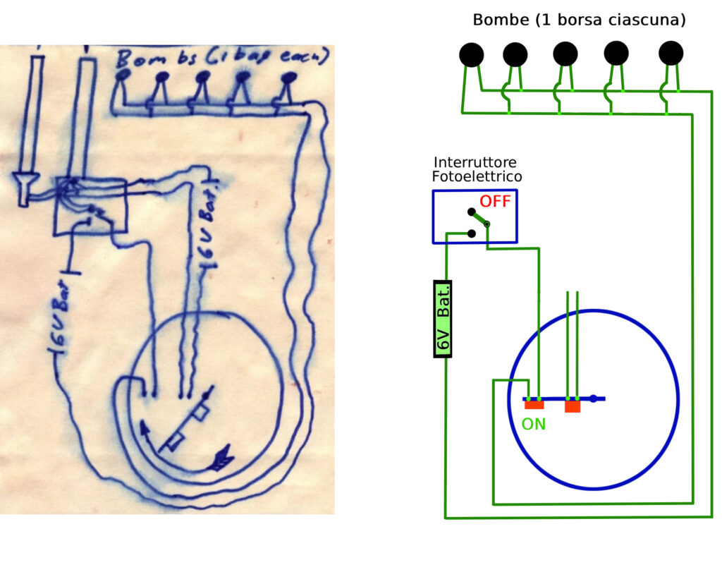• Il secondo percorso è collegato al meccanismo di attivazione dell’ordigno ed è alimentato dalla seconda batteria da 6 volt.