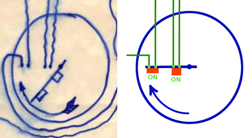 Analizzando lo schema, l’orologio appare come l’elemento centrale attorno a cui si articola il sistema: alla lancetta sono collegate due lamelle elastiche in rame che, raggiunta la posizione indicata come le ore 9, chiudono simultaneamente — ON – ON — due percorsi del circuito— evidenziati in verde —