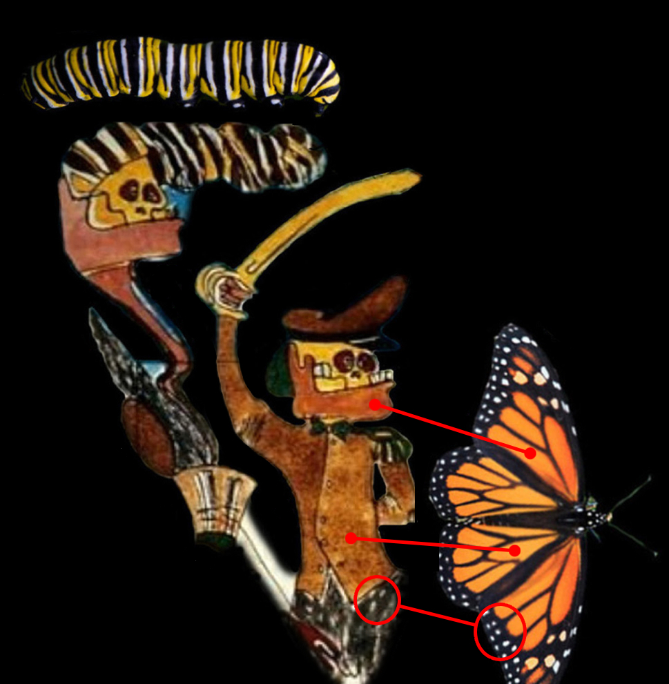 I colori del bruco riprodotti nel quadro corrispondono a quelli reali della specie, mentre le cromie riportate dal generale coincidono con quelle delle ali della farfalla adulta. Questa doppia corrispondenza crea un legame simbolico tra il bruco e la farfalla, suggerendo un processo di rinascita già inscritto nella struttura stessa dell’opera.