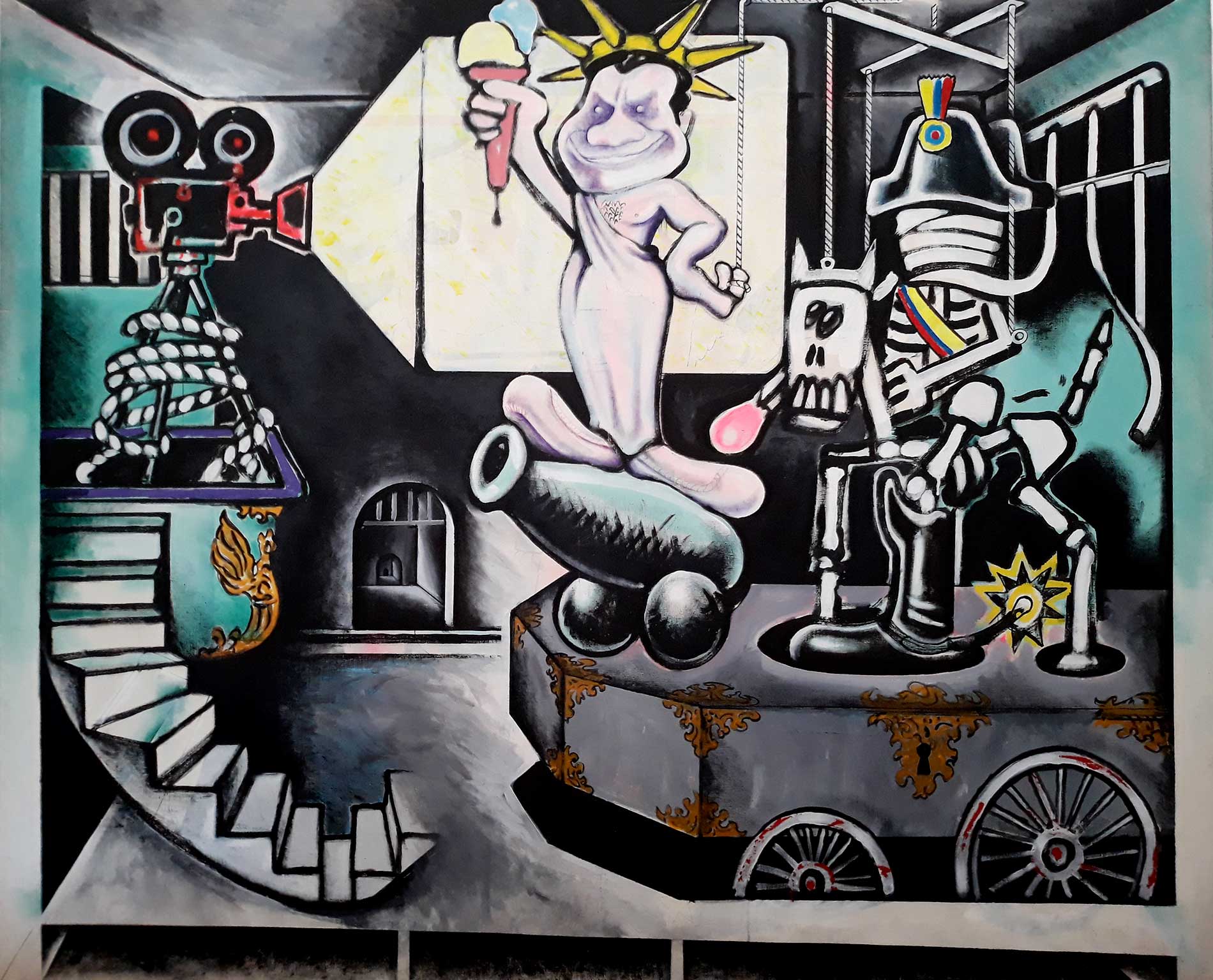 Il punto centrale è che in questo quadro il significato non nasce né dal disegno né dal colore presi isolatamente, ma dalla loro interazione. Le linee costruiscono una struttura concettuale precisa, quasi architettonica; il colore non si limita a riempire, ma completa, amplifica e definisce ciò che il disegno suggerisce. Senza il colore, il messaggio dell’opera rimarrebbe sospeso, come un meccanismo che non può ancora funzionare.