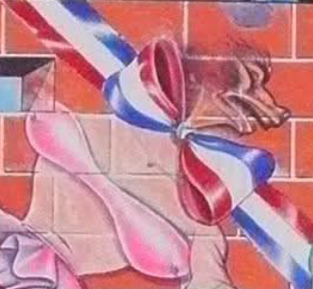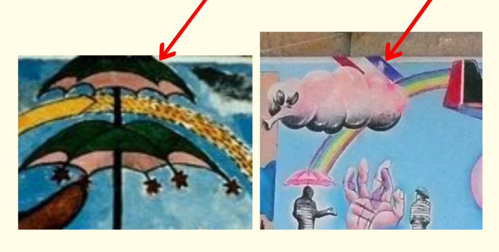 La scelta cromatica non è casuale: i colori delle strisce della bandiera coincidono con quelli del nastro annodato a fiocco nell’opera di Olivares, e in entrambi i casi tali colori sono organizzati in bande, creando un ulteriore legame visivo tra le due rappresentazioni.