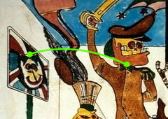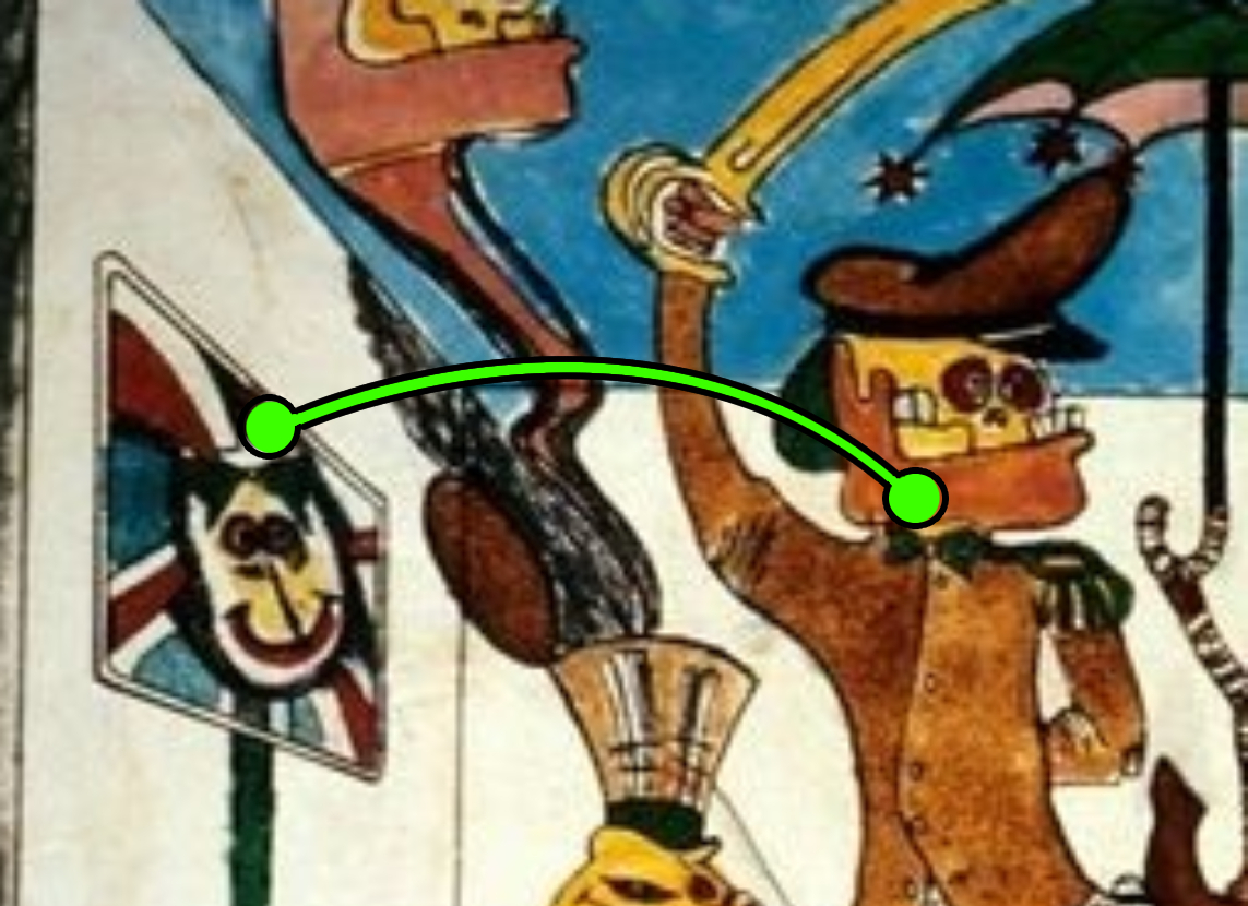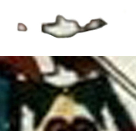 Come si può osservare questa porzione della ”mandibola” del generale —evidenziata in rossodovrebbe essere separata dal resto del corpo, analogamente a quanto avviene con la parte posteriore. L’area gialla risulta infatti intenzionalmente delimitata da questa sezione, che non dovrebbe essere presente. Questa decisione di circoscrivere e chiudere l’area gialla, relativa al collo scoperto, suggerisce che l’autore abbia voluto delineare questa figura sopra il fiocco, in maniera tale da richiamare quella presente sull’altro fiocco.