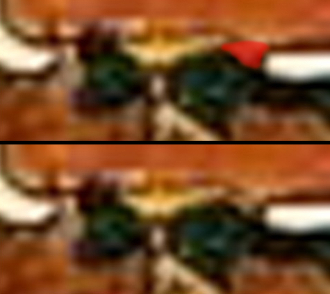 Tale angolo è riscontrabile in entrambe le figure, nella stessa zona.  Naturalmente ingrandendo l’immagine si perde un po’ la definizione, ma ritengo comunque abbastanza  soddisfacente la risoluzione dei dettagli più piccoli come questo, tanto da poter affermare che, osservando il dipinto dal vero, questo angolo retto, emergerebbe con maggiore chiarezza in entrambe le figure, anche in quella del generale, dove la figura è più piccola e di conseguenza è meno evidente.