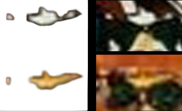 Questa operazione di ritaglio è necessaria per mettere in evidenza le forme: con la risoluzione disponibile, infatti, ingrandendo al massimo le due figure risultano troppo sfumate nel contesto originale.. Osservando invece il dipinto dal vero, le due figure apparirebbero molto più definite, esattamente come le ho ritagliate per metterle in evidenza. La mia operazione non è un’alterazione forzata, bensì una valorizzazione di ciò che già esiste nell’opera, perché è proprio questo che chiunque potrebbe verificare osservando direttamente il quadro.
