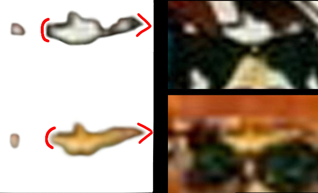 • Nella parte inferiore si nota una prominenza — evidenziata in rosso — una sorta di “gobba”, che — pur derivando dall’adattamento della forma sul fiocco — risulta collocata più verso sinistra in entrambe le figure (cioè verso la destra della figura stessa). Di fatto, entrambe mostrano un’estensione più marcata proprio al di sopra del lato sinistro del fiocco.