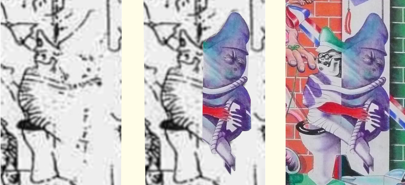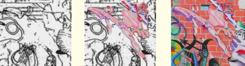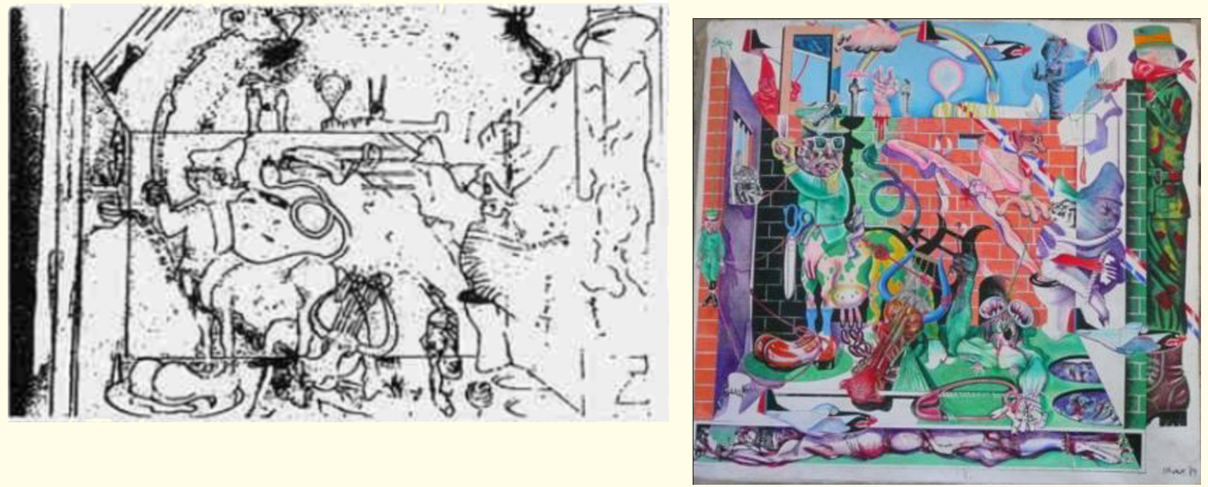 La vera anomalia riguarda proprio il bozzetto del pittore cileno. L’opera presenta mancanze strutturali in punti cruciali — linee assenti, elementi incompleti — che finiscono per avvicinarla artificialmente a Sogno di Fatascienza. Eppure, osservandola con attenzione, affiorano ancora le tracce delle linee originarie: un segno evidente che il disegno non era nato in questo stato e che gli elementi mancanti erano stati effettivamente tracciati. Ciò che appare come un’assenza sembra quindi il risultato di un’alterazione successiva, selettiva e irregolare. Non sappiamo cosa sia accaduto al bozzetto, ma queste modifiche lo rendono una base comparativa decisamente discutibile.