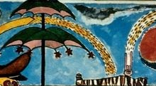 Possiamo notare due piccoli personaggi sulla parete, uno con l’ ombrello e l’altro senza. Sopra di loro è ben evidente una nuvola nera carica d’acqua, che fa cadere la pioggia su di loro; solo il personaggio a sinistra, che ha l’ombrello, riesce a ripararsi, mentre l’altro è chiaramente esposto alla pioggia. Su questa nuvola nera si distingue anche quella che sembra proprio essere una tromba d’aria, che spinge la pioggia, indirizzandola verso lo sciacquone, con l’ intento di riempirlo, creando così quel moto parabolico di acqua, che è presente anche in Sogno di Fatascienza.