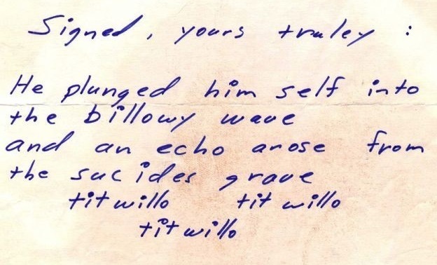 • L’autore del messaggio, in questa occasione, sostituisce il soprannome (Zodiac) che usa nella sua corrispondenza, con un passaggio su un annegamento, tratto dall’operetta comica “The Mikado” di Gilbert e Sullivan,’“ Ecco come l’autore del testo decide di firmare: