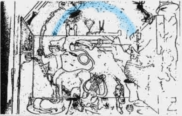 Come abbiamo visto, nel quadro Sogno di Fatascienza, sono stati ripresi elementi direttamente dalle opere del pittore cileno, poi riadattati in funzione di specifiche esigenze. Come possiamo osservare, il Generale Pinochet in questo contesto, tiene in mano una spada, che è connessa alla nuvola tramite quello che appare come un fulmine. Ciò che invece risulta particolarmente significativo, è che nella parte centrale superiore si riconosce un arco formato da numerose gocce d’ acqua — come ho evidenziato — .