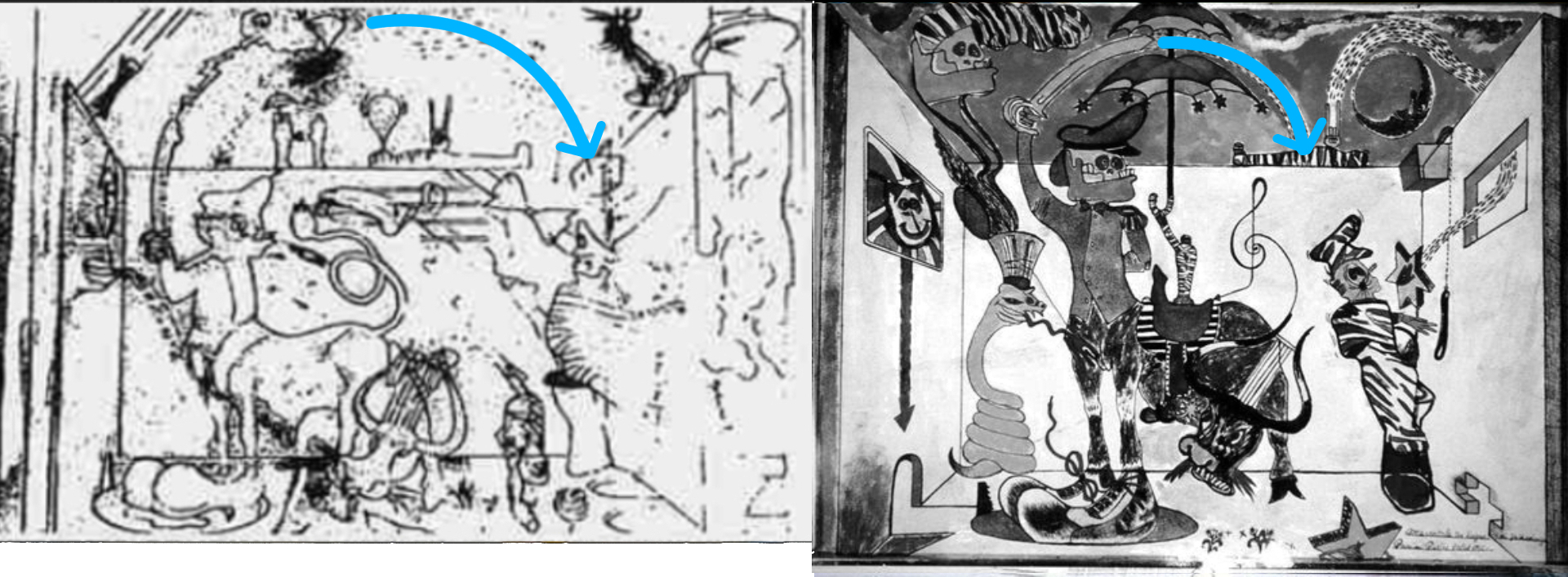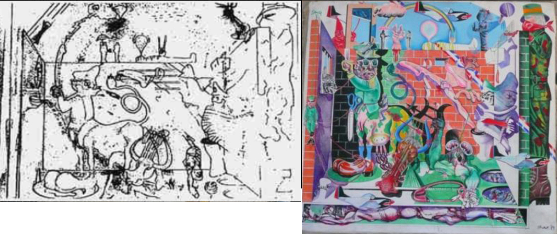 Risulta evidente che questo bozzetto gli sia servito per pianificare la composizione, studiare le proporzioni e sviluppare certe idee, per poi arrivare alla versione definitiva. Come possiamo ben vedere, Olivares ha cambiato alcune idee rispetto al bozzetto, come l’ arco nella parte centrale superiore della scena, sostituendolo con un arcobaleno. É evidente che l’ autore di Sogno di Fatascienza aveva a disposizione le immagini di queste due opere del pittore cileno, da cui ha attinto, estrapolando gli elementi di suo interesse per poi rielaborarli in base alle sue necessità. Quindi ha selezionato e “copiato” un elemento distintivo, presente esclusivamente nel bozzetto e assente nell’altro, evidenziando così un’appropriazione consapevole e mirata.