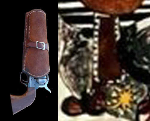 La fondina è rappresentata dalla banda di protezione della sella, mentre l’impugnatura della pistola corrisponde al sottopancia. In altre parole, quella porzione della sella non raffigura semplicemente elementi dell’equipaggiamento: è la stilizzazione di una pistola, integrata e mimetizzata nella struttura stessa della sella.