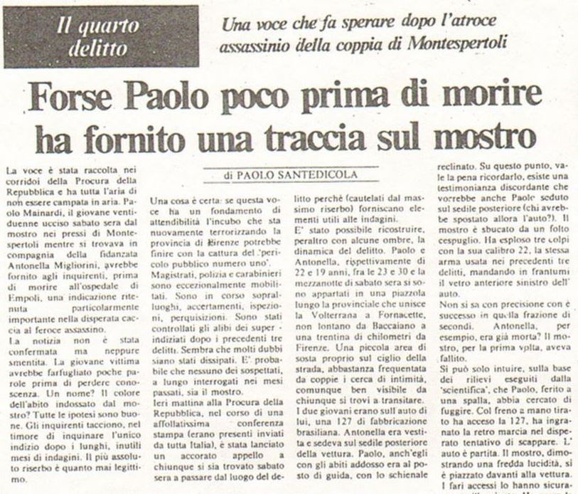 A questo fece seguito una fase ancora più intricata, nella quale il collegamento tra i delitti del mostro di Firenze e l’omicidio del ’68 emerse in circostanze poco chiare, forse riconducibili al ricordo di un maresciallo o a un biglietto anonimo che invitava a tornare proprio su quel delitto.