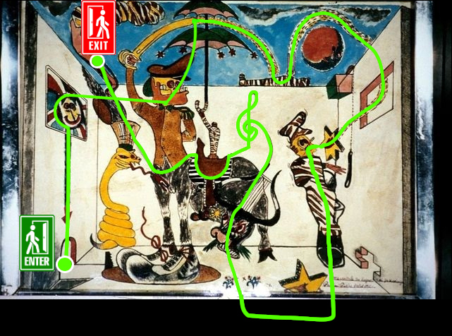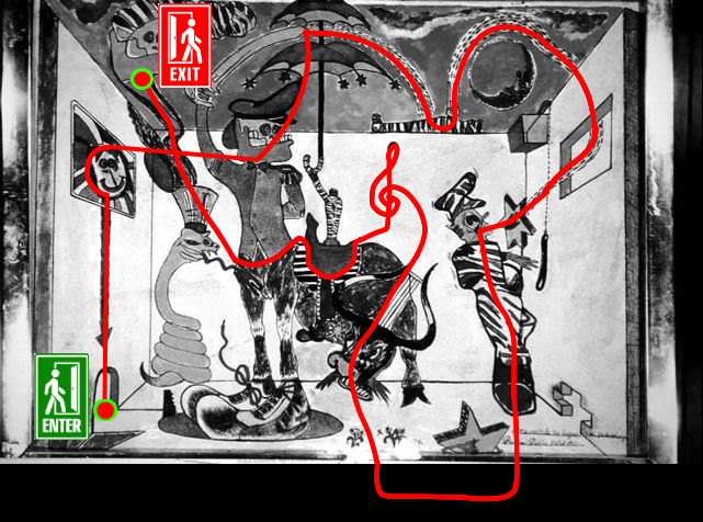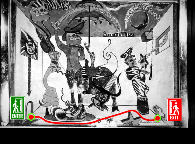 In questo modo si delinea il percorso all’interno del quadro. Sogno di Fatascienza è, in realtà, ciò che potremmo definire una “stanza di fuga“, dotata anche di un’uscita che conduce alla soluzione sbagliata: