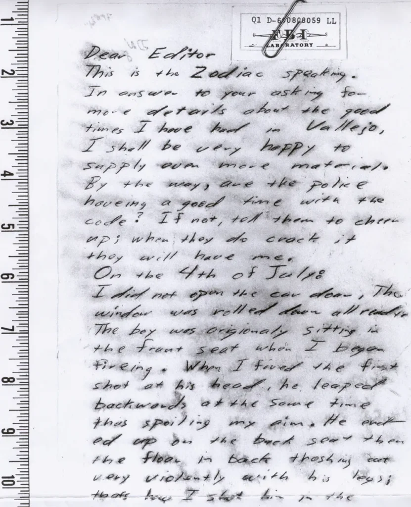1969, 4 agosto. Prima lettera firmata “Zodiac”, traduzione: