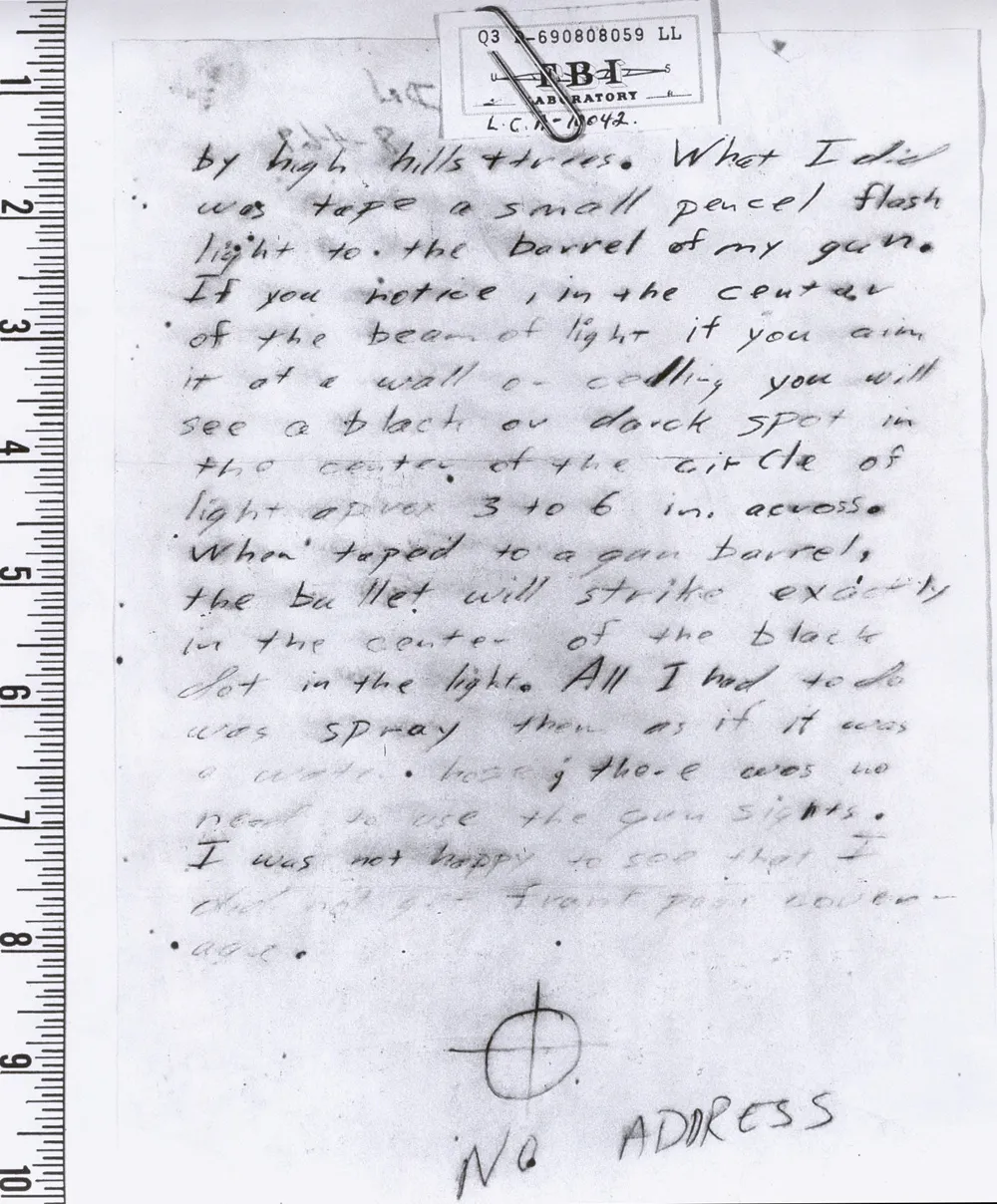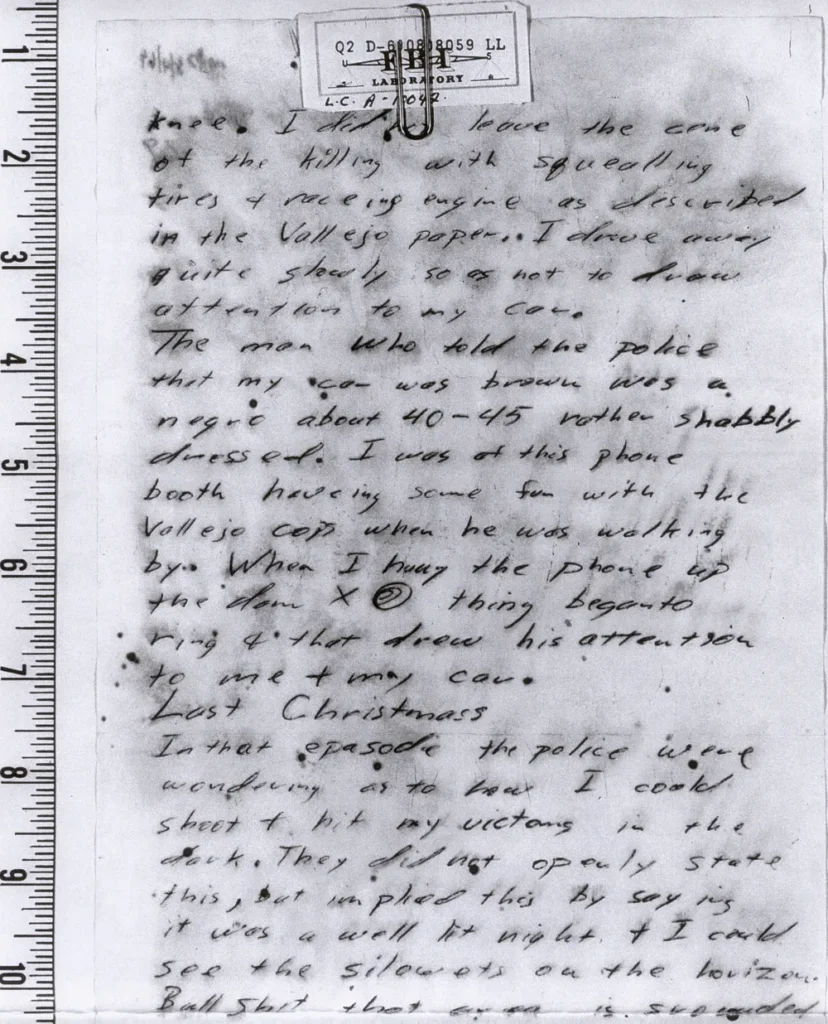 In quella lettera relativa al duplice omicidio avvenuto il 20 dicembre 1968 sul Lake Herman Road, Zodiac corregge alcune dichiarazioni fatte dalla polizia riguardo alla notte del delitto. Il killer, descrivendo il duplice omicidio, spiega come abbia fissato una torcia sulla canna della pistola, utilizzando il fascio di luce come mirino per sparare nel buio, descrivendo il procedimento nei minimi dettagli. Il passaggio riportato in quella pagina è: «Tutto quello che ho dovuto fare è stato innaffiarli come se fosse il tubo dell’acqua; non c’è stato bisogno di usare il mirino della pistola».