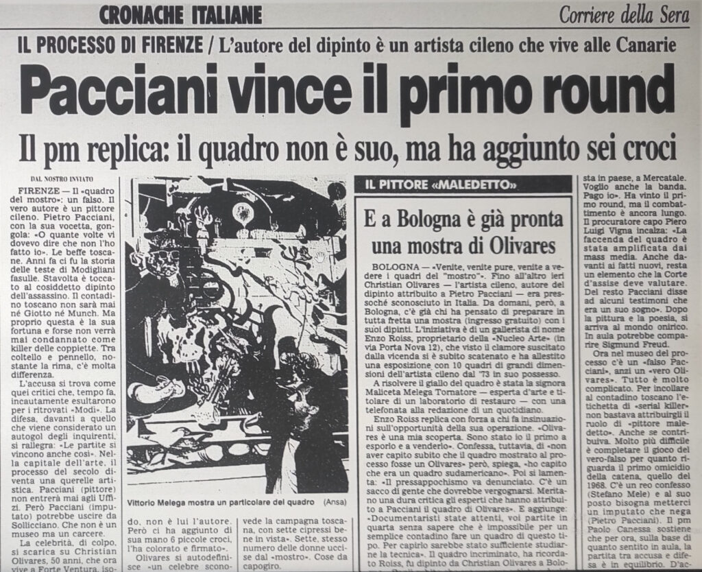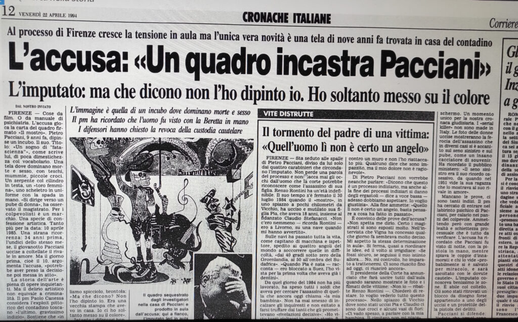 Il dipinto era stato notato anche da una testimone oculare nel 1986, quando si trovava ancora appeso nel piccolo appartamentino da affittare che Pacciani aveva ristrutturato in via Sonnino. La testimone faceva parte di un gruppo musicale di giovani che avevano preso in affitto l’appartamento per utilizzarlo come sala prove. In tempi non sospetti, Pacciani le aveva anche spiegato il significato del quadro, affermando di averlo realizzato lui stesso, “ma nella sua testimonianza al processo la donna non ricordava praticamente quasi nulla di quella spiegazione”.