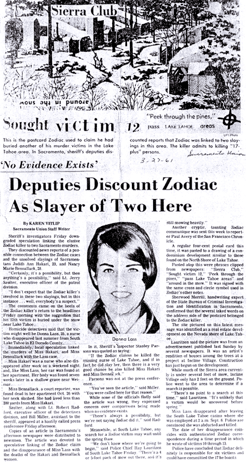 Questa è una cartolina inviata da Zodiac, il 22 Marzo del 1971 al giornalista Paul Avery, del San Francisco Chronicle. Una mappa criptica, che suggeriva il ritrovamento dei resti di Donna Lass, la povera ragazza scomparsa nel 1970 nei pressi del Lake Tahoe.