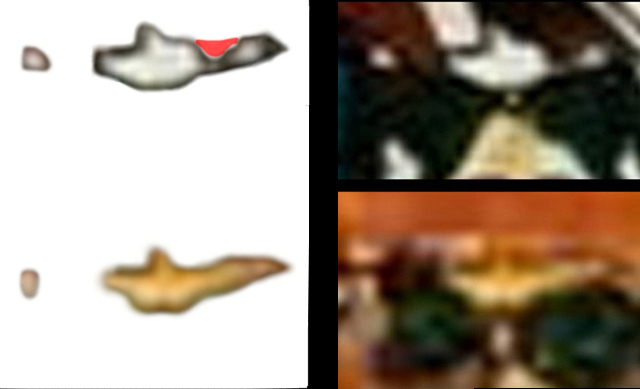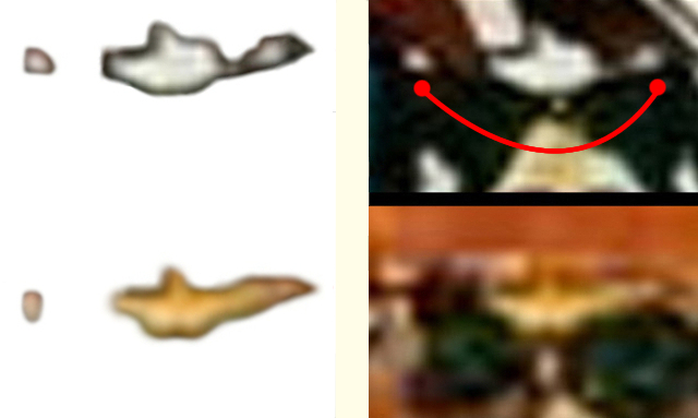 • La mia operazione di ritaglio non è affatto arbitraria. Il ritaglio ha lo scopo di mettere in risalto le forme e i dettagli. Non si tratta di un’alterazione forzata, bensì di una valorizzazione di ciò che è già presente e verificabile direttamente sul quadro. In questi ritagli ho solo ridimensionato le due figure affinché abbiano la stessa grandezza, rendendo il confronto più efficace.